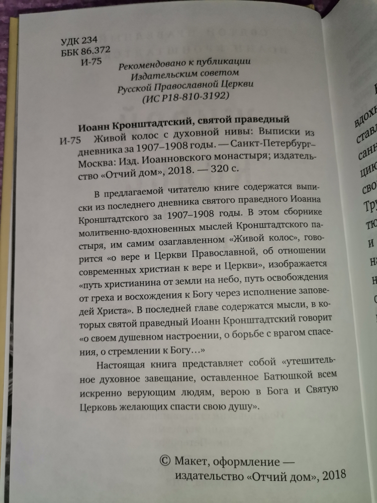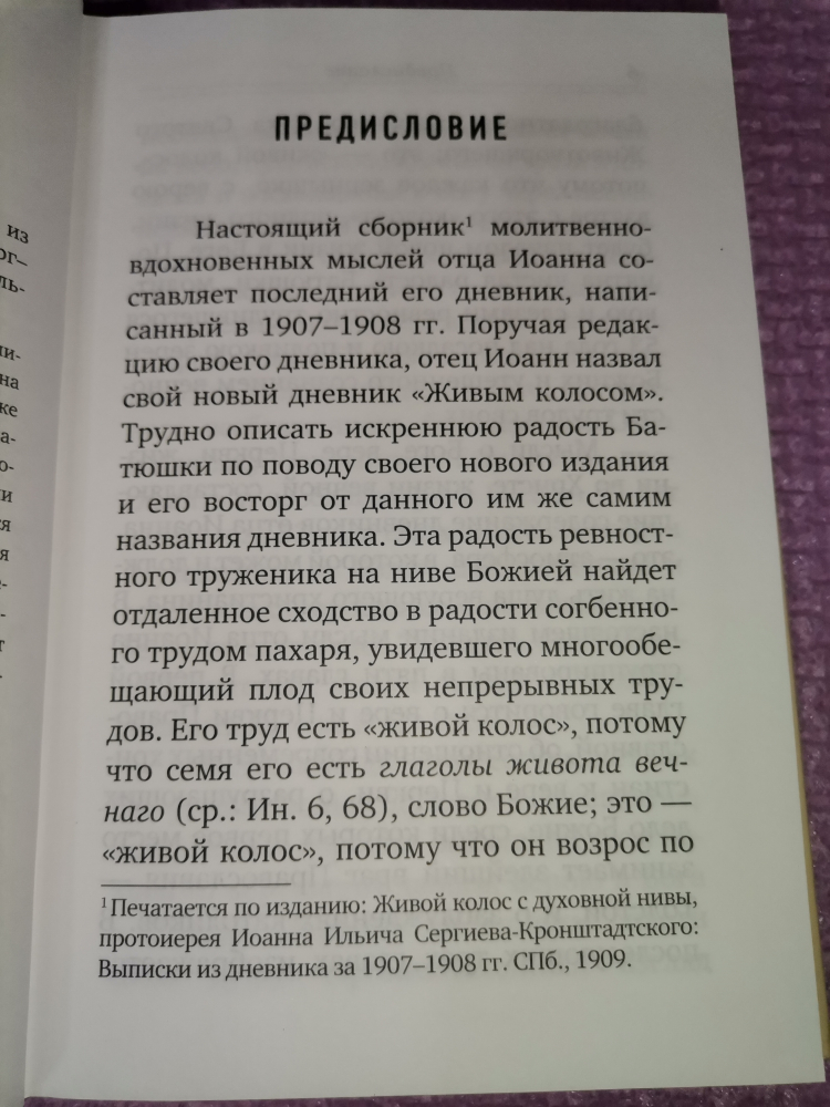 В предлагаемой читателю книге содержатся выписки из последнего дневника святого праведного Иоанна Кронштадтского за 1907-1908 годы. В этом сборнике молитвенно-вдохновенных мыслей Кронштадтского пастыря, им самим озаглавленном "Живой колос", говорится "о вере и Церкви Православной, об отношении современных христиан к вере и Церкви", изображается "путь христианина от земли на небо, путь освобождения от греха и восхождения к Богу через исполнение заповедей Христа". В последней главе содержатся мысли, в которых святой праведный Иоанн Кронштадтский говорит "о своем душевном настроении, о борьбе с врагом спасения, о стремлении к Богу..."
