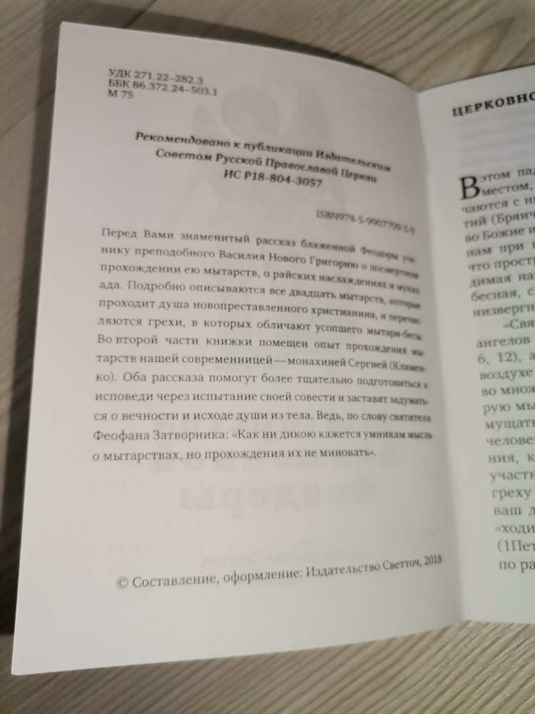 Перед Вами знаменитый рассказ блаженной Феодоры ученику преподобного Василия Нового Григорию о посмертном прохождении ею мытарств, о райских наслаждениях и муках ада. Подробно описываются все двадцать мытарств, которые проходит душа новопреставленного христианина, и перечисляются грехи, в которых обличают усопшего мытари-бесы. Во второй части книжки помещен опыт прохождения мытарств нашей современницей - монахиней Сергией (Клименко). Оба рассказа помогут более тщательно подготовиться к исповеди через испытание своей совести и заставят задуматься о вечности и исходе души из тела. Ведь, по слову святителя Феофана Затворника: "Как ни дикою кажется умникам мысль о мытарствах, но прохождения их не миновать"