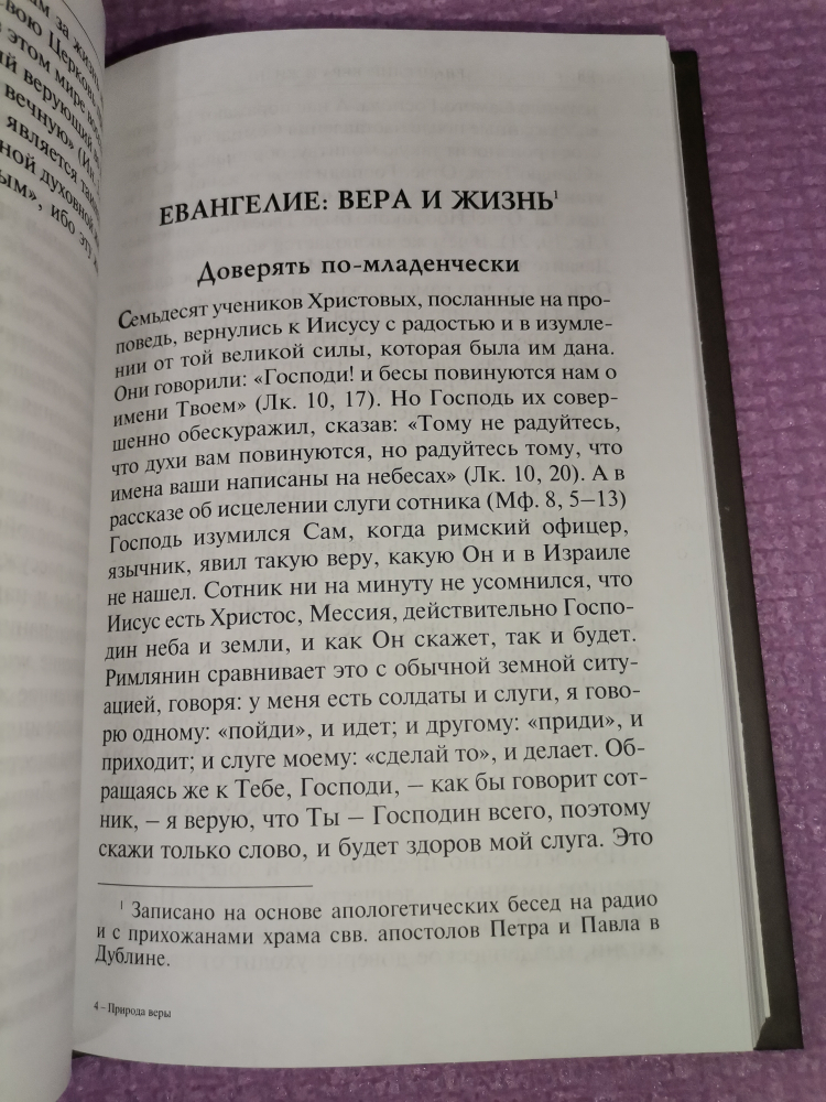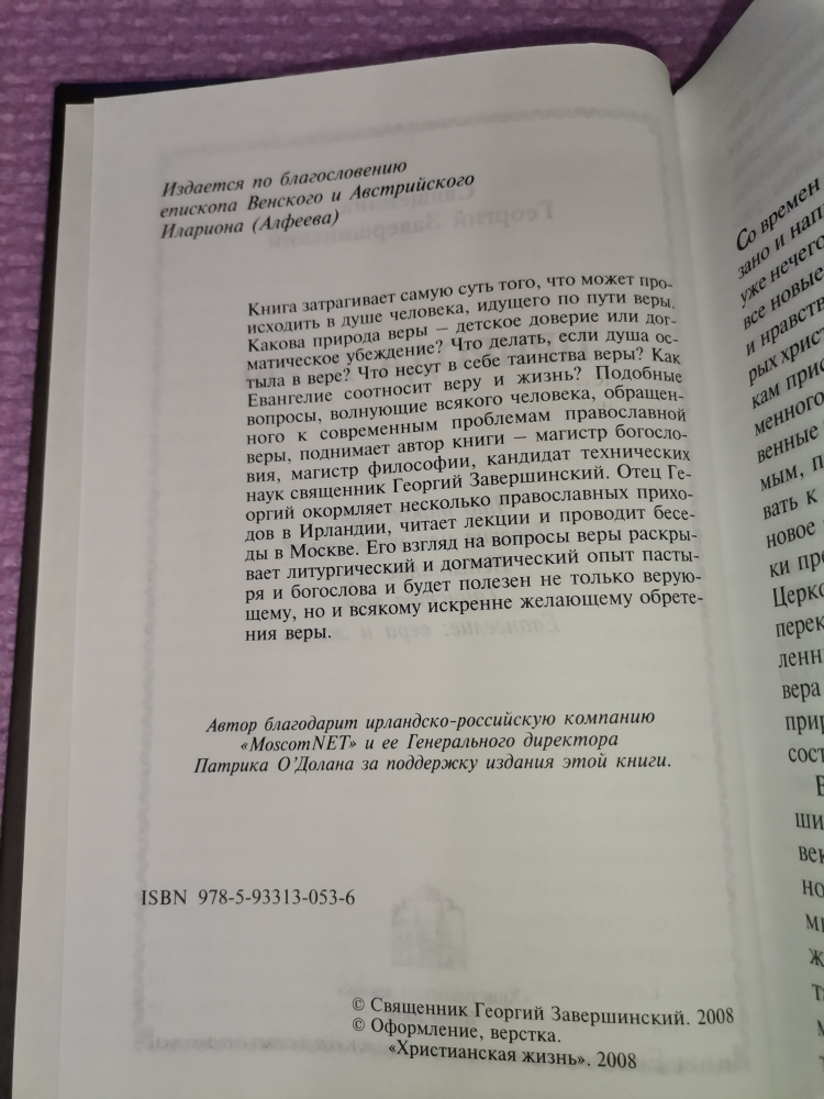 Книга затрагивает самую суть того, что может происходить в душе человека, идущего по пути веры. Какова природа веры - детское доверие или догматическое убеждение? Что делать, если душа остыла в вере? Что несут в себе таинства веры? Как Евангелие соотносит веру и жизнь? Подобные вопросы, волнующие всякого человека, обращенного к современным проблемам православной веры, поднимает автор книги - магистр богословия, магистр философии, кандидат технических наук священник Георгий Завершинский. Отец Георгий окормляет несколько православных приходов в Ирландии, читает лекции и проводит беседы в Москве. Его взгляд на вопросы веры раскрывает литургический и догматический опыт пастыря и богослова и будет полезен не только верующему, но и всякому искренне желающему обретения веры.
