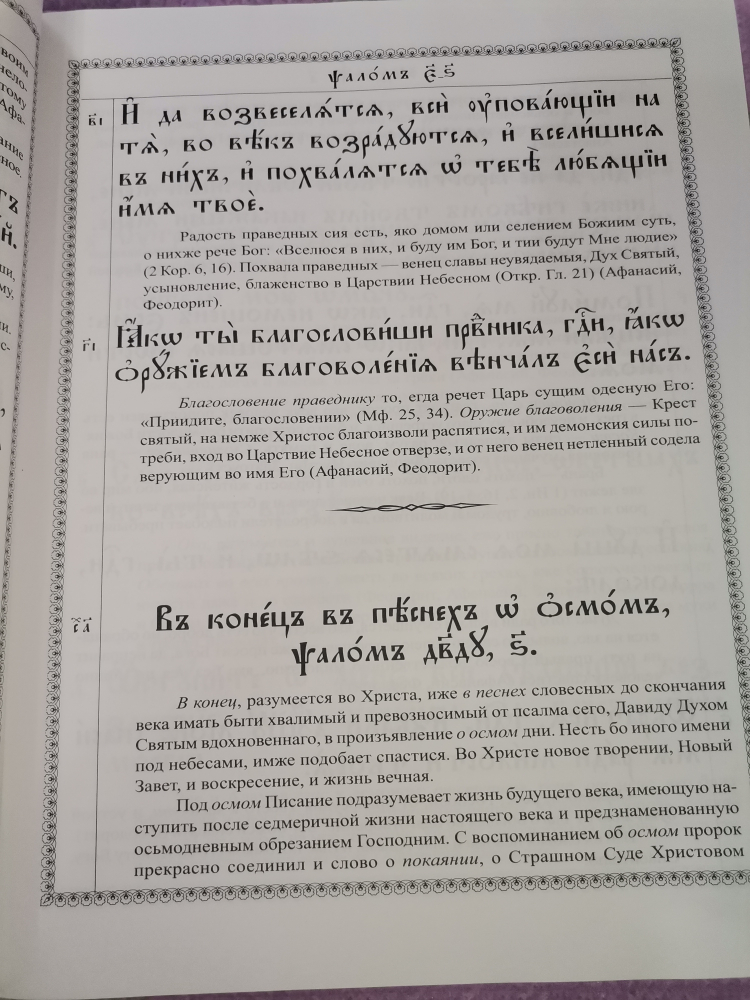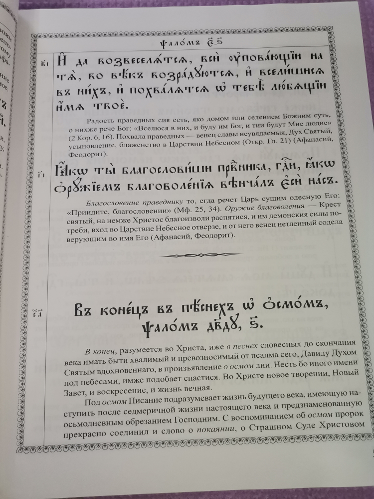 Книга царя и пророка Давида занимает особое место в Священном Предании Православной Церкви. Святитель Василий Великий говорит о ней, что Псалтирь больше и выше всех книг, потому что она Бога славит вместе с Ангелами и прогоняет и уязвляет бесов. Недаром Псалтирь с древности использовалась для молитвы храмовой и домашней, и сейчас она является основой православного богослужения.