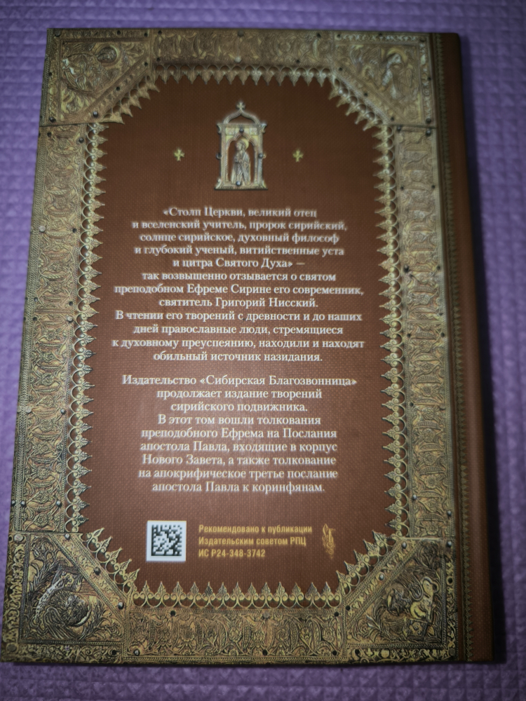 "Столп Церкви, великий отец и вселенский учитель, пророк сирийский, солнце сирийское, духовный философ и глубокий ученый, витийственные уста и цитра Святого Духа" - так возвышенно отзывается о святом преподобном Ефреме Сирине его современник, святитель Григорий Нисский. В чтении его творений с древности и до наших дней православные люди, стремящиеся к духовному преуспеянию, находили и находят обильный источник назидания. В книге из собрания творений преподобного Ефрема Сирина представлены его толкования на Послания апостола Павла, входящие в корпус Нового Завета, а также толкование на апокрифическое третье послание апостола Павла к Коринфянам.