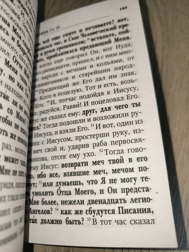 В настоящем издании Святого Евангелия на русском языке слова Господа нашего Иисуса Христа выделены жирным шрифтом для сугубого внимания к ним.