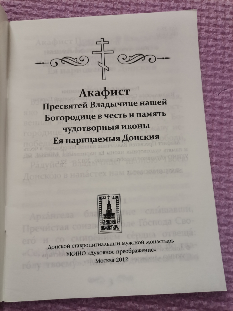 Издание включает в себя акафист Пресвятей Владычице нашей Богородице в честь и память чудотворныя иконы Ея нарицаемыя Донския. Пред иконой Пресвятой Богородицы "Донская" молятся об избавлении от иноплеменных и о сохранении Российской державы, о помощи православному русскому воинству, в трудные для России времена.