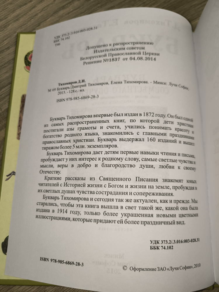 Букварь Тихомирова дает детям первые навыки чтения, письма и счета, пробуждает у них интерес к родному слову, самые светлые чувства и мысли, веры в добро и благородство души, любви к своему Отечеству.Краткие рассказы из Священного Писания знакомят юных читателей с историей жизни с Богом и жизни на земле, пробуждая в их светлых душах чувства сострадания и сопереживания.Букварь Тихомирова и сегодня так же актуален, как и прежде. Издатели старались, чтобы эта книга вышла в свет такой же, какой она была издана в 1914 году, только украшенная новыми цветными иллюстрациями, которые придают ей более праздничный вид. Текст издания набран на современном русском языке.