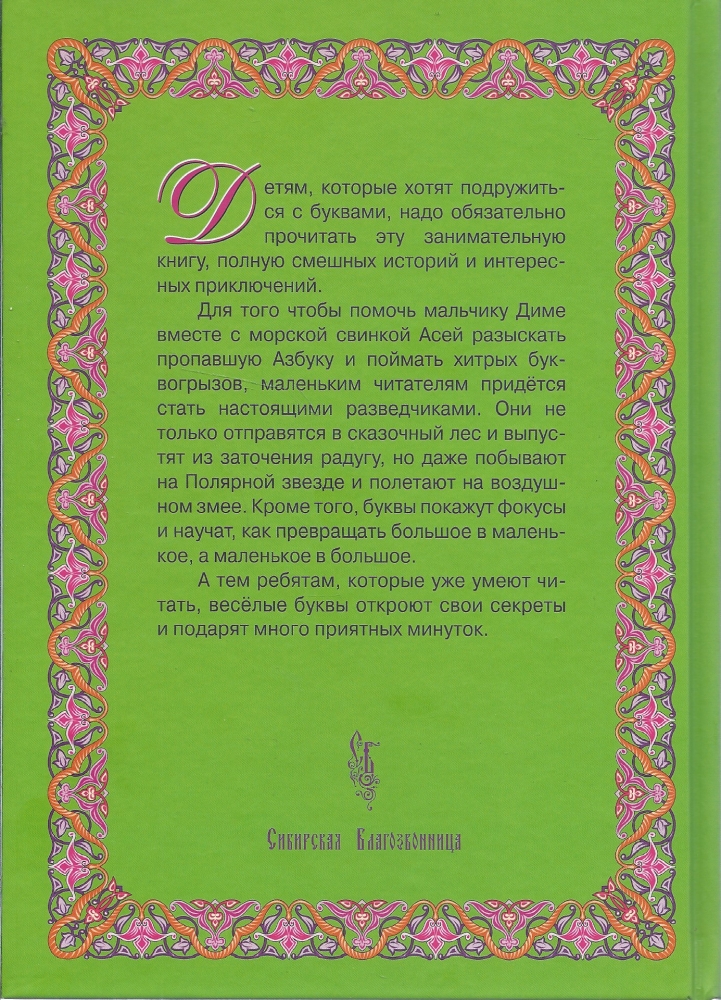 Детям, которые хотят подружиться с буквами, надо обязательно прочитать эту занимательную книгу, полную смешных историй и интересных приключений. Для того чтобы помочь мальчику Диме вместе с морской свинкой Асей разыскать пропавшую Азбуку и поймать хитрых буквогрызов, маленьким читателям придётся стать настоящими разведчиками. Они не только отправятся в сказочный лес и выпустят из заточения радугу, но даже побывают на Полярной звезде и полетают на воздушном змее. Кроме того, буквы покажут фокусы и научат, как превращать большое в маленькое, а маленькое в большое. А тем ребятам, которые уже умеют читать, весёлые буквы откроют свои секреты и подарят много приятных минуток.