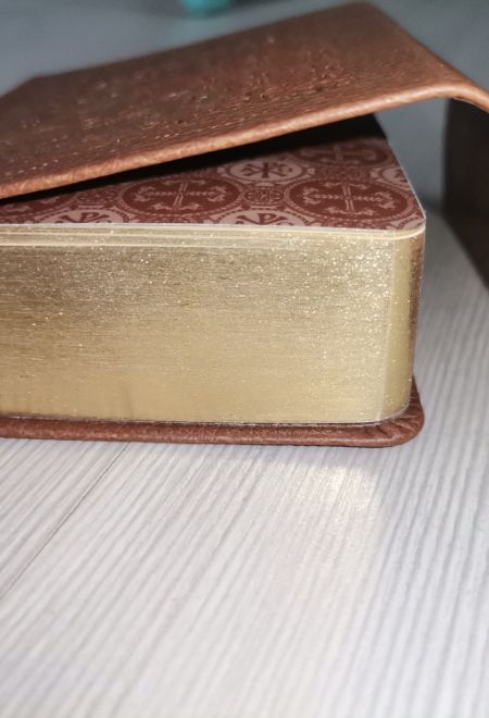 Святое Евангелие на русском языке кожаном переплете с магнитным клапаном, с блинтовым тиснением и с тиснением золотой фольгой. Текст отпечатан стандартным шрифтом на офсетной бумаге, использован золотой обрез блока, форзац выполнен из дизайнерской бумаги.