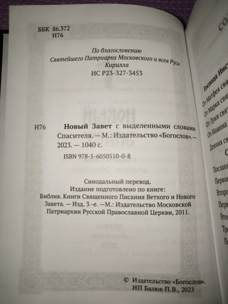 Новый Завет на русском языке. Комфортный для чтения шрифт, закладка. Слова Спасителя выделены жирным шрифтом. В издание включена молитва перед чтением Евангелия.