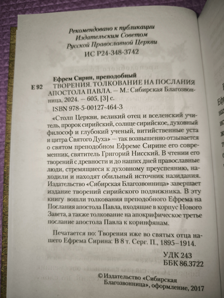"Столп Церкви, великий отец и вселенский учитель, пророк сирийский, солнце сирийское, духовный философ и глубокий ученый, витийственные уста и цитра Святого Духа" - так возвышенно отзывается о святом преподобном Ефреме Сирине его современник, святитель Григорий Нисский. В чтении его творений с древности и до наших дней православные люди, стремящиеся к духовному преуспеянию, находили и находят обильный источник назидания. В книге из собрания творений преподобного Ефрема Сирина представлены его толкования на Послания апостола Павла, входящие в корпус Нового Завета, а также толкование на апокрифическое третье послание апостола Павла к Коринфянам.